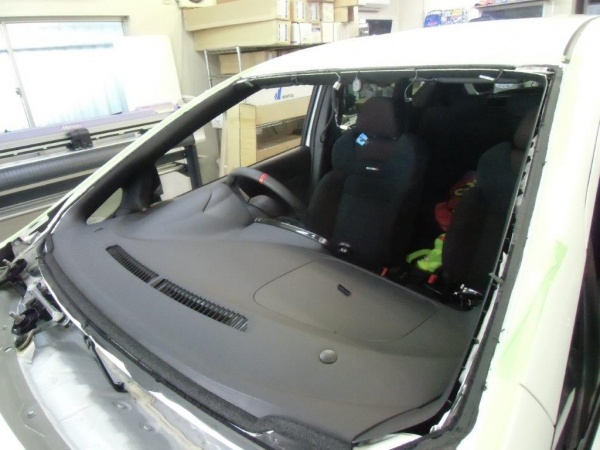 まずは、フロントガラスの廻りに装着されているサイドモールやワイパー部のカウルパネルを取り外したのち、専用接着剤で取り付けられているフロントガラスを車両から取り外していきます。取り外しを行ったことで、再使用が不可能となった左右のサイドモールも新品に交換していきます。